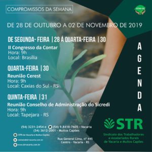 Agenda da Semana 28 de outubro de 2019 EVENTOS, GERAL Artigos relacionados “Mel de Vacaria Conquista 3º Lugar na Expointer e Reforça Parceria de Sucesso entre STR e Coopervapis” GERAL STR de Vacaria e Muitos Capões realizará nos próximos meses a Primeira Semana Sindical RÁDIO FETAR NÃO ADMITE FLEXIBILIZAR NR-31 GERAL