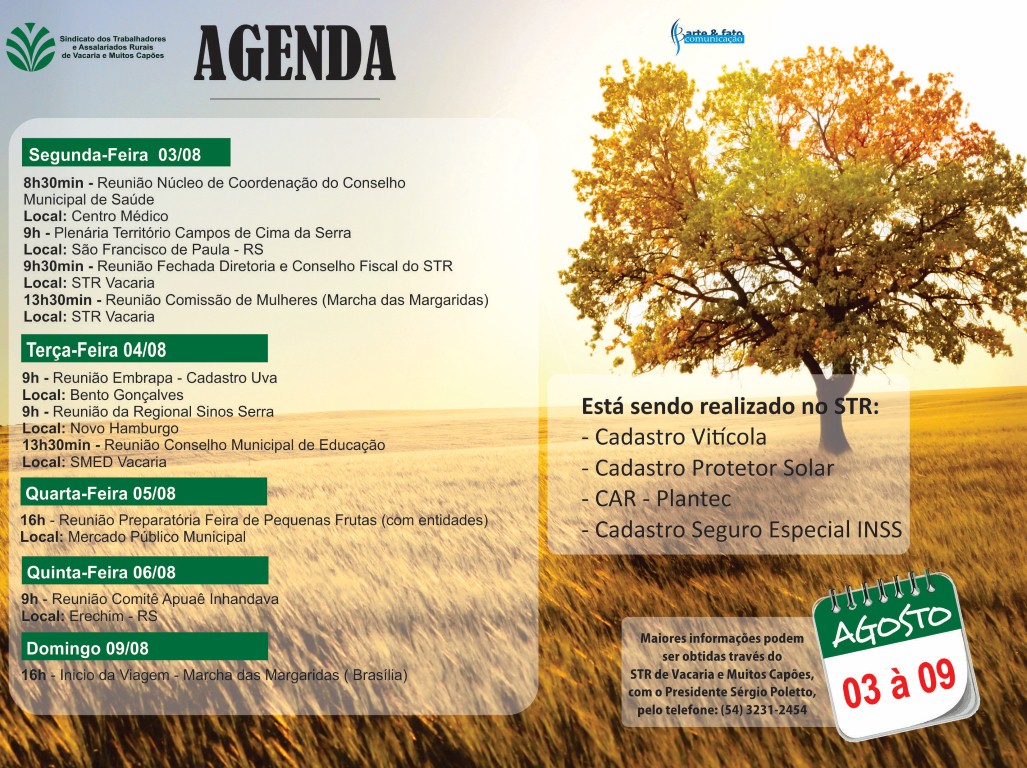 De 03/08 a 09/08 31 de julho de 2015 EVENTOS Confira as atividades do STR de Vacaria e Muitos Capões para a semana de 03 a 09 de agosto de 2015! Artigos relacionados De 11 à 15 de Julho EVENTOS De 02 a 06 de Novembro EVENTOS De 20 à 24 de Junho EVENTOS