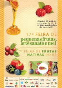 Evento serás entre os dias 6, 7 e 8 de dezembro deste ano no Mercado Publico de Vacaria. As entidades organizadoras da 17ª Feira de Pequenas Frutas, Artesanato e Mel e 7ª Feira de Frutas Nativas do RS esperam um dos maiores eventos já realizados, pois a feira já contabiliza mais de 80 expositores.