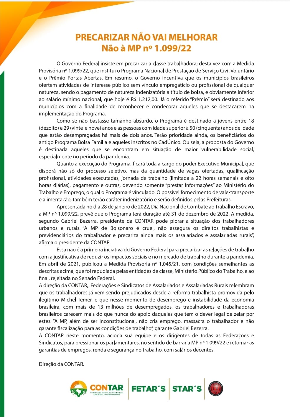 Apresentada no dia 28 de janeiro de 2022, Dia Nacional de Combate ao Trabalho Escravo, a MP nº 1.099/22, prevê que o Programa terá duração até 31 de dezembro de 2022. A medida, segundo Gabriel Bezerra, presidente da CONTAR pode piorar a situação dos trabalhadores urbanos e rurais. “A MP de Bolsonaro é cruel, não assegura os direitos trabalhistas e previdenciários do trabalhador e precariza ainda mais os assalariados e assalariadas rurais”, afirma o presidente da CONTAR.
