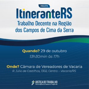 Vacaria será sede, no dia 29 de outubro, do Projeto ItineranteRS – Trabalho Decente na Região dos Campos de Cima da Serra, promovido pela Justiça do Trabalho do Rio Grande do Sul. O encontro acontecerá na Câmara de Vereadores de Vacaria, das 13h30min às 17h, e tem como objetivo promover o diálogo e a conscientização sobre as boas práticas nas relações de trabalho.