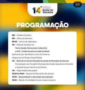 Com o tema “Saúde, Democracia, Soberania e SUS – Cuidar do povo é cuidar do Brasil”, a programação inicia com credenciamento às 8h, seguida de abertura oficial, palestra temática e, na parte da tarde, uma importante roda de conversa sobre a situação da saúde no município de Vacaria.