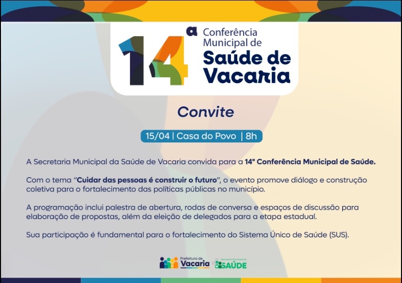O Sindicato dos Trabalhadores Rurais de Vacaria e Muitos Capões reforça o chamado à comunidade para participar da 14ª Conferência Municipal de Saúde de Vacaria, que acontece no dia 15 de abril, a partir das 8 horas da manhã, na Casa do Povo.