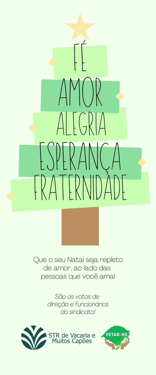 A direção e os funcionários do Sindicato aproveitam este período para desejar a todos os associados, parceiros e à comunidade em geral um Natal repleto de amor, alegria, esperança e fraternidade, valores que fortalecem a convivência, a união e a luta coletiva ao longo de todo o ano.