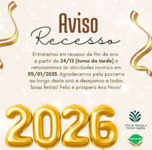 O Sindicato dos Trabalhadores Rurais de Vacaria e Muitos Capões informa está em recesso de fim de ano a partir do dia 24 de dezembro, com retorno das atividades normais previsto para o dia 5 de janeiro de 2025, as 8h da manhã.